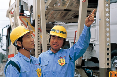 突然の納車依頼から非常事態時の輸送支援まで、柔軟に対応し実力を発揮します。阪神大震災や3.11東日本大震災の非常事態では、被災地周辺の輸送力は激減しました。当社はこれらの非常事態においても、自動車メーカーの依頼を受けて、真っ先に、食料燃料補給班と共に輸送支援隊を現地に派遣し、非常事態に対応しました。いかなる状況、条件においても、顧客満足を目指し柔軟に対応します。