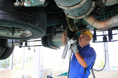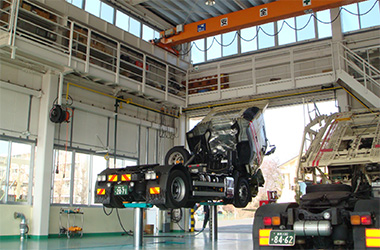 リフトや天井クレーン、そしてオイルチェンジャー等最新の設備を整えることにより省力化を図り。明るく清潔な環境を実現しています。